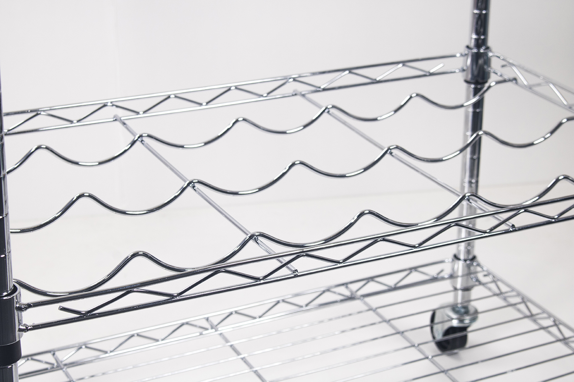 4 tier rack combining an iron frame and MDF board. 4 moveable wheels . The 15mm MDF board can be used as a platform.With handle.Durable metal construction with polished chrome finishing