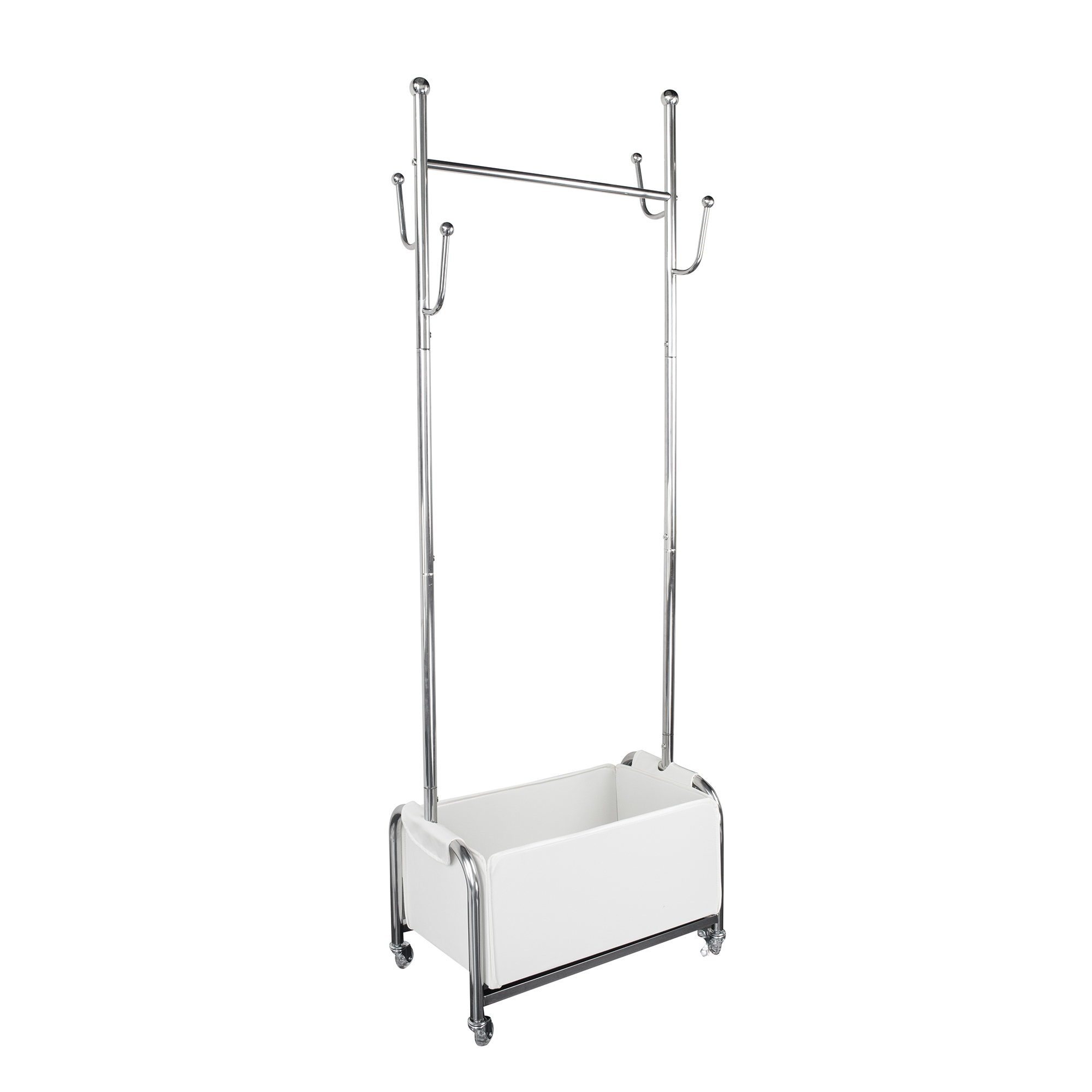 Frame crafted with stainless steel for long-lasting durability. 4 cactus hooks, perfect for hanging coats, scarves, hats and more. PU storage basket and wheels for easy maneuverability.